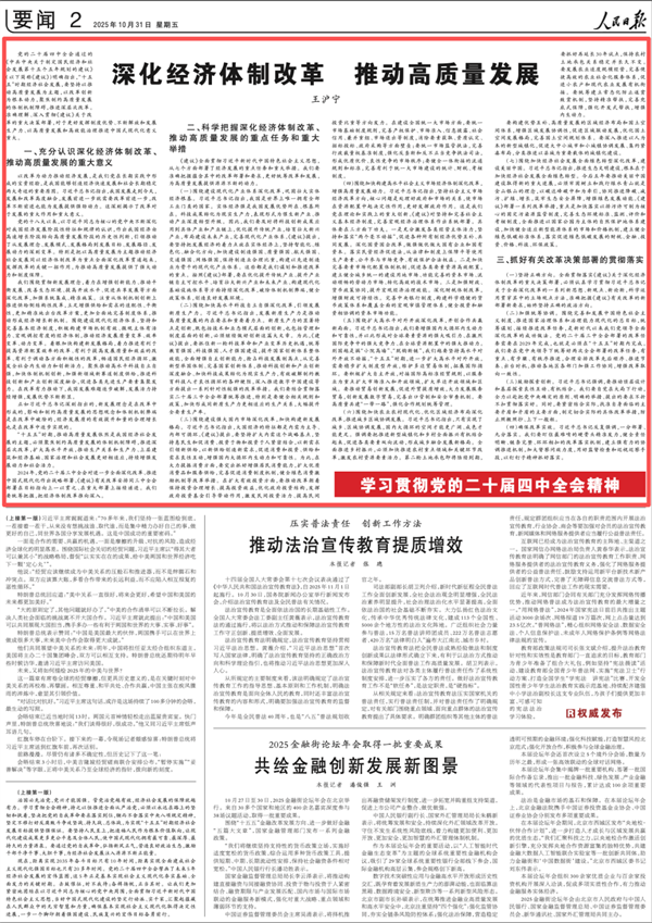 10月31日,《人民日报》要闻版刊发中共中央政治局常委、全国政协主席王沪宁的署名文章《深化经济体制改革 推动高质量发展》。