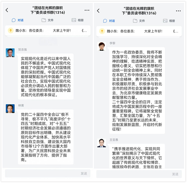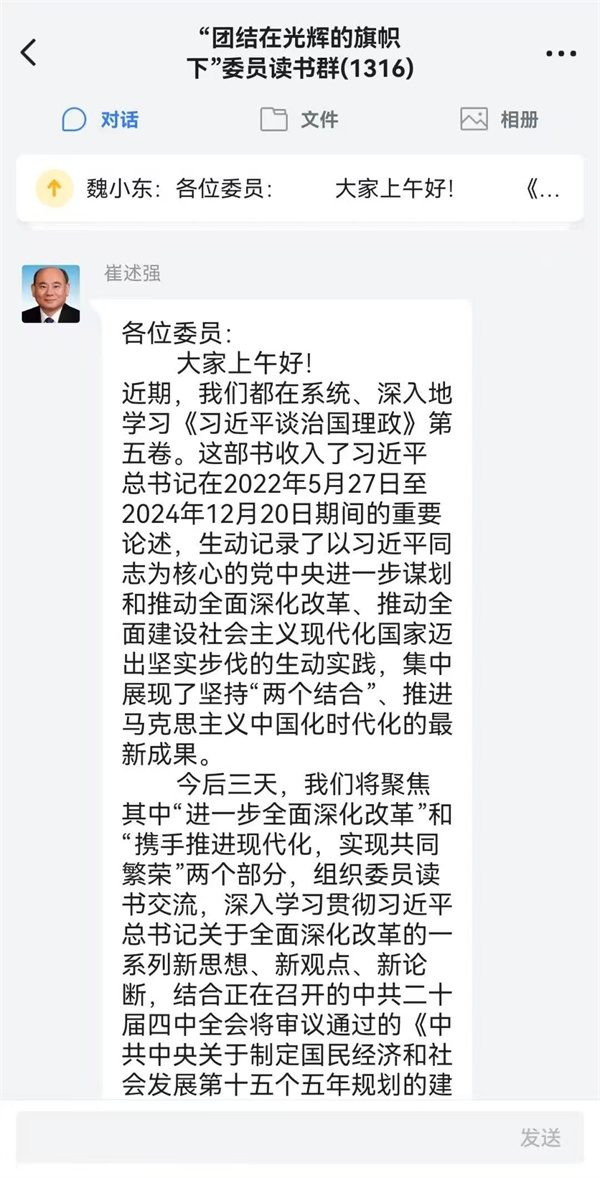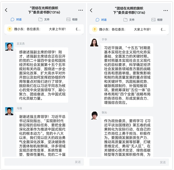 提案委员会精心制定专题读书学习方案,设计思考题目供委员参考讨论。注重发挥分党组引领作用,提案委分党组成员王文杰、张树森、张淼、傅钰、马强、徐全胜、王斌围绕学习主题接力进行导读,中共党员委员带头交流发言,读书群里深学细悟氛围浓厚。