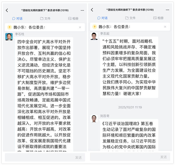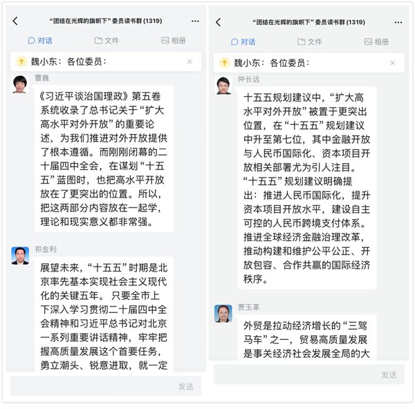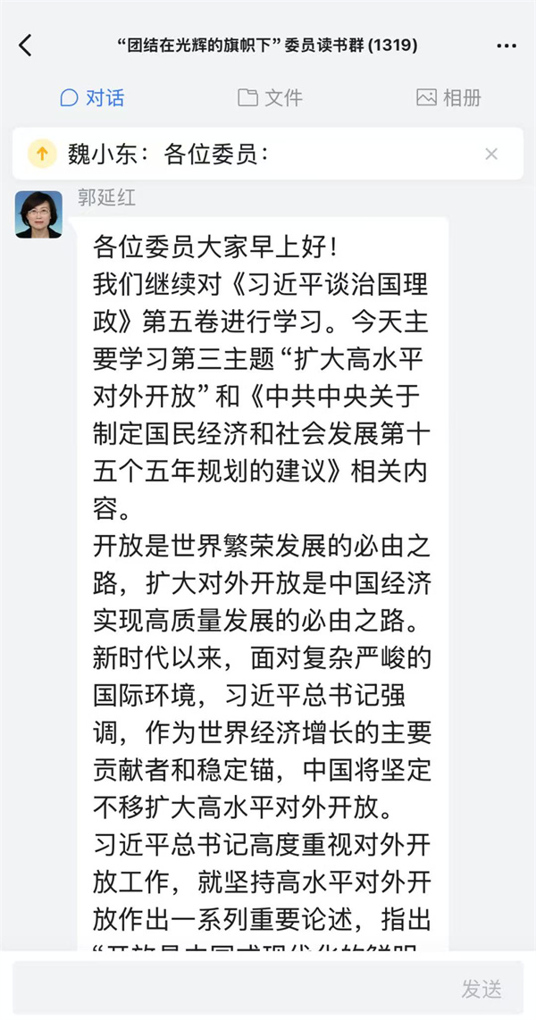 郭延红表示,要自觉把学习贯彻党的二十届四中全会精神和《习近平谈治国理政》第五卷结合起来,在读原著、学原文、悟原理中不断提高马克思主义理论素养,自觉做新时代党的创新理论的坚定信仰者和忠实践行者。要牢牢把握“推动高质量发展”这一“十五五”时期我国经济社会发展主题,完整准确全面贯彻新发展理念,以改革创新为根本动力,推进深层次改革,扩大高水平开放,坚定不移走好高质量发展之路。要充分发挥界别优势和专业所长,立足本职岗位,找准履职切入口,为助力实现高水平对外开放、推动高质量发展建好言、献好策,为谱写中国式现代化北京篇章作出更大贡献。