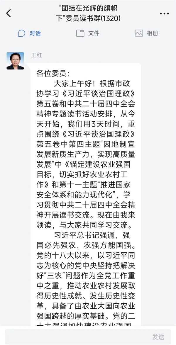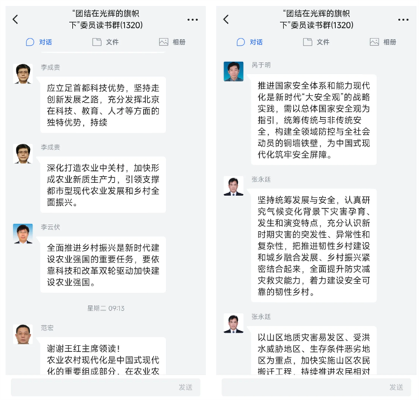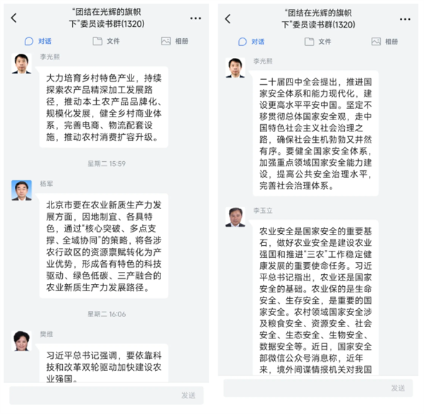 农业和农村委员会精心制定专题读书学习方案,围绕学习主题收集整理了10辑学习材料,设计思考题目引导委员交流讨论。注重发挥分党组成员和主任会议成员引领作用,围绕学习主题进行接力导读,中共党员委员带头发言,全体委员深入开展学习交流,在读书群里形成了浓厚的学习氛围。