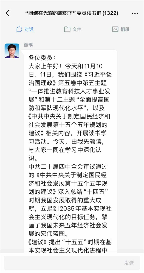 燕瑛表示,要将学习贯彻中共二十届四中全会精神和《习近平谈治国理政》第五卷结合起来,坚持读原著、学原文、悟原理。希望各位委员把学习成果转化为履职尽责的实际成效,自觉把思想和行动统一到中共二十届四中全会精神上来,深刻认识和把握“十五五”时期的重大任务部署,广泛凝心聚力,积极履职尽责,为加快建设教育强国、科技强国、人才强国,全面提高国防和军队现代化水平,全面推进中国式现代化、实现中华民族伟大复兴作出更大贡献。