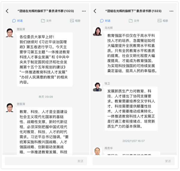 委员们表示,要把学习贯彻中共二十届四中全会精神和《习近平谈治国理政》第五卷有机统一起来,牢牢把握中国式现代化这一时代背景,保持战略定力,增强必胜信心,积极识变应变求变,深刻把握教育、科技、人才一体推进的时代要求,扎实推进教育科技人才“三位一体”良性循环。要发挥委员主体作用和自身专长,立足本职岗位主动作为,在教育领域坚守立德树人初心,培育兼具家国情怀与创新能力的时代新人,在科技领域秉持自立自强信念,聚焦“卡脖子”问题勇攀技术高峰,在人才工作中坚持不拘一格,为各类人才搭建干事创业的广阔平台。要树立系统思维,主动打破部门壁垒与行业界限,积极参与协同创新实践,让教育、科技、人才三者在具体工作中深度耦合、协同发力、同向而行,在建设教育强国、科技强国、人才强国的征程上不断取得新突破,为实现中华民族伟大复兴提供坚实支撑。