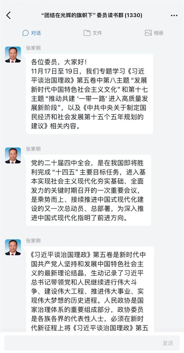 文旅卫体和文史委员会高度重视委员读书学习工作,精心谋划、周密部署、认真组织,推动学习走深走实。强化分党组成员引领,围绕学习主题接力进行导读,中共党员委员带头发言,带动全体委员深入交流研讨。将《习近平谈治国理政》第五卷和“十五五”规划建议中文化、医药卫生、体育等相关内容紧密结合,设计针对性思考题目,引导委员深入学思践悟、融会贯通。依托履职平台开展线上交流学习的同时,统筹线上线下协同学习,组织部分委员赴中国外文局了解《习近平谈治国理政》著作全球出版发行情况,感受习近平新时代中国特色社会主义思想对于推动构建人类命运共同体所产生的深远影响。