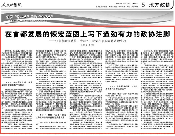 从科技创新的前沿阵地到民生改善的细微角落,从文化传承的悠悠古韵到城市治理的全新探索,首都发展的每一次跃升、京华大地的每一抹新貌,都离不开习近平总书记重要讲话精神的引领。2025年是“十四五”规划收官之年,也是“十五五”规划谋篇布局之年。“在助力‘十四五’规划圆满收官的同时,今年要把围绕‘十五五’规划编制建言作为履职重点。”在年初的常委会会议上,市政协主席魏小东强调并作出部署。市政协把“十五五”规划编制建言融入年度重点协商议题,开展专项提案征集和社情民意信息收集,召开座谈会广泛征求意见建议,并向市委报送相关建议报告,一条条睿智之策、务实之举,必将再次汇入时代洪流。