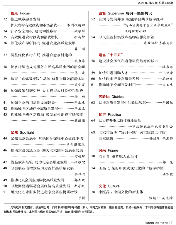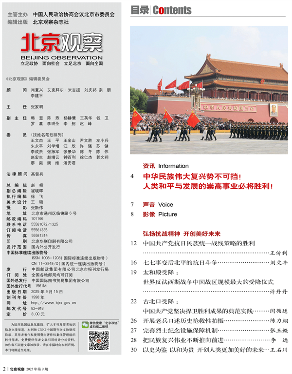 - 金秋时节,世界的目光再次聚焦中国。恰逢中国人民抗日战争暨世界反法西斯战争胜利80周年,本期《北京观察》特别策划推出“弘扬抗战精神 开创美好未来”专题报道,并通过资讯、影像、声音等栏目,围绕纪念中国人民抗日战争暨世界反法西斯战争胜利80周年,多维度呈现阅兵式现场盛况,汇集多位委员观礼后的感悟,通过历史纵深解读、现实行动倡议、委员心声共鸣等讲述抗战历史价值与当代传承。传递了铭记历史、缅怀先烈、珍爱和平、开创未来的主题,激发民族自豪感与奋进力量。