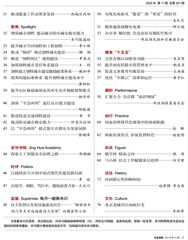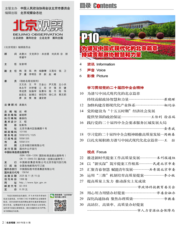 金秋时节,丰收在望。党的二十届四中全会胜利召开。全会对“十五五”时期我国经济社会发展作出系统谋划和战略部署,为乘势而上、接续推进中国式现代化建设擘画宏伟蓝图、指明前进方向。本期《北京观察》围绕“学习贯彻党的二十届四中全会精神”开设专题,邀请委员从“加快构建首都现代化产业体系”“加强党的建设”“服务区域发展大局”“助推高质量发展”“发挥委员主体作用更好履职尽责”等方面畅谈学习感悟,为谱写中国式现代化的北京篇章持续贡献政协智慧和力量。