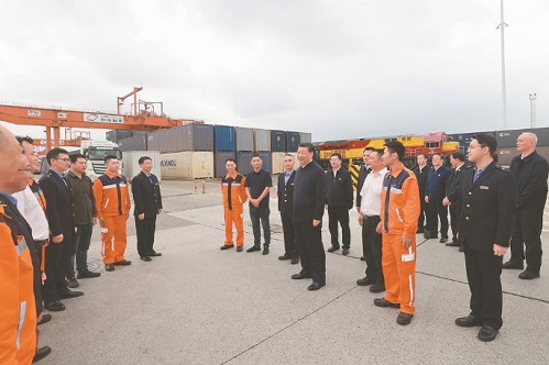 随后,习近平来到重庆铁路集装箱中心站,听取货物集散、运输路径、运营成本和效益等介绍,同货车司机、列车司机、装卸工人、场站管理人员等亲切交流,询问他们的工作强度、劳动保护、节假日休息和收入情况。习近平说,大家在物流一线,也是在对外开放一线,通过你们的辛勤劳动,很多商品跨越山海、走向世界,你们的工作很有意义。推动西部大开放、促进西部大开发,物流很重要,大家要继续努力,不断创造新的业绩,作出新的贡献。