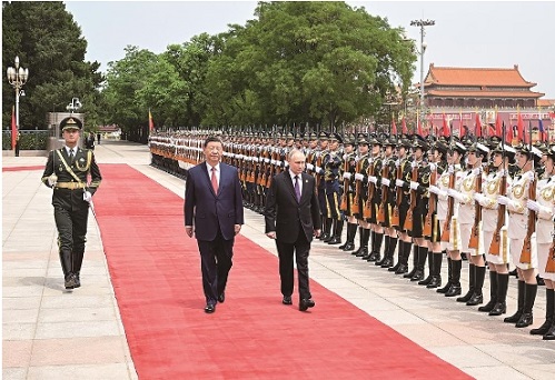 5月16日上午,国家主席习近平在北京人民大会堂同来华进行国事访问的俄罗斯总统普京举行会谈。这是会谈前,习近平在人民大会堂东门外广场为普京举行隆重欢迎仪式。新华社记者 饶爱民 摄