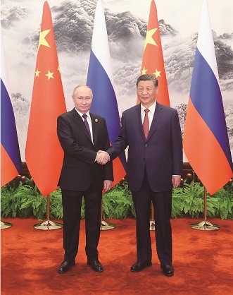普京表示,我很高兴在就任新一届俄罗斯总统后再次访华。去年3月习近平主席也在连任后不久即对俄进行国事访问。这是我们两国的友好传统,表明双方对加强新时代俄中全面战略协作伙伴关系的高度重视。今年是中华人民共和国成立75周年,也是俄中建交75周年,值得我们共同庆祝。发展俄中关系不是权宜之计,不针对第三方,有利于国际战略稳定。俄方愿同中方持续扩大双边合作,密切在联合国、金砖国家、上海合作组织等框架内沟通协作,推动建立更加公正合理的国际秩序。