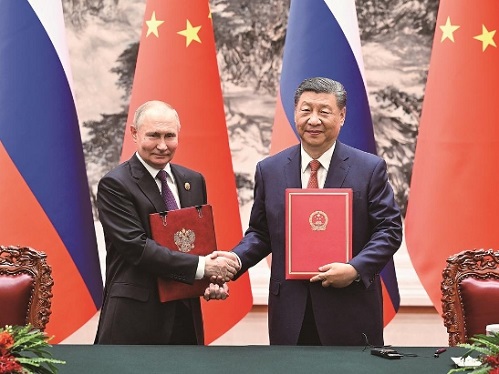 5月16日上午,国家主席习近平在北京人民大会堂同来华进行国事访问的俄罗斯总统普京举行会谈。这是会谈后,两国元首共同签署并发表《中华人民共和国和俄罗斯联邦在两国建交75周年之际关于深化新时代全面战略协作伙伴关系的联合声明》。新华社记者 饶爱民 摄