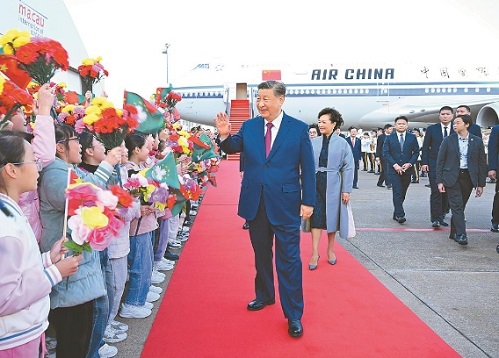 16时许,习近平乘坐的专机徐徐降落在澳门国际机场。习近平和夫人彭丽媛走出舱门,向欢迎人群挥手致意。澳门警察乐队奏响热情洋溢的欢迎曲,舞龙舞狮表演喜气欢腾。舷梯旁,两名少年儿童向习近平和彭丽媛献上鲜花。在澳门特别行政区行政长官贺一诚和夫人郑素贞陪同下,习近平和彭丽媛同前来迎接的人员亲切握手。数百名澳门青少年和各界群众代表挥动国旗、特别行政区区旗和鲜花,表达热烈的欢迎。