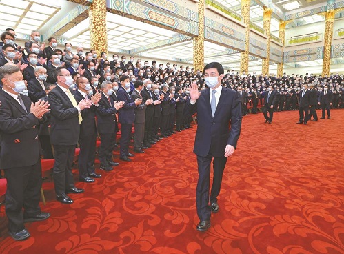 5月17日,中共中央政治局常委、全国政协主席王沪宁在北京人民大会堂会见全国台湾同胞投资企业联谊会第六届会员代表大会代表并与大家合影留念。(王晔 摄)