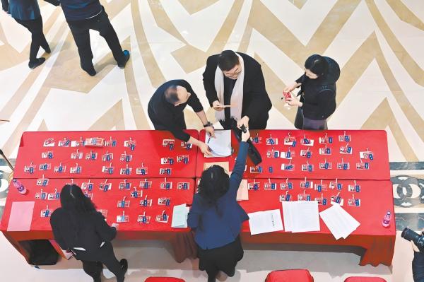 市政协十四届三次会议今天开幕。昨天下午,700余名市政协委员陆续报到。在现场,委员们在工作人员的引导下签到、领取相关证件和会议材料。报到流程快捷高效,井然有序。