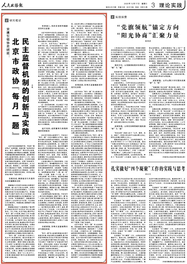 在北京市委的全面领导下,市政协以“每月一题”专项治理需求为导向,通过组织重构与流程再造双轮驱动,打破界别和专委会原有边界,构建起与党政治理同频共振的民主监督新机制。这一创新以问题为中心、以实效为目标,推动委员履职既在决策前提供精准有效的意见建议,也在政策执行中开展嵌入式、跟进式监督,真正将政协职能深度嵌入党政治理链条,实现建言、执行、监督、问效一体贯通,显著增强了民主监督在回应民生、化解难题中的系统性与实效性。