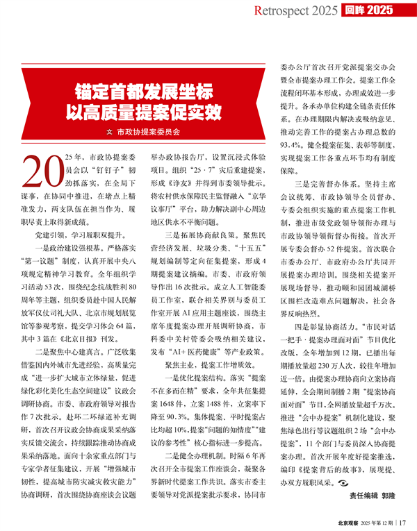 二是聚焦中心建真言。广泛收集借鉴国内外城市先进经验,高质量完成“进一步扩大城市立体绿量,促进绿化彩化美化生态空间建设”议政会调研协商。市委、市政府领导对报告作7次批示。赴环二环绿道补充调研,首次召开议政会协商成果采纳落实反馈交流会,持续跟踪推动协商成果采纳落地。面向十余家重点部门与专家学者征集建议,开展“增强城市韧性,提高城市防灾减灾救灾能力”协商调研,首次围绕协商座谈会议题举办政协报告厅,设置沉浸式体验项目。组织“25·7”灾后重建提案,形成《诤友》并得到市委领导批示。将农村供水保障民主监督融入“京华议事厅”平台,助力解决副中心周边地区供水不平衡问题。