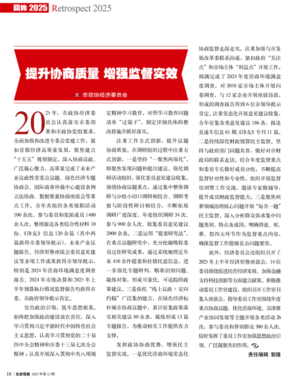 2025年,市政协经济委员会认真落实市委部署和市政协党组要求,全面加强和改进专委会党建工作,紧扣首都经济高质量发展,聚焦建言“十五五”规划制定,深入协商议政、广泛凝心聚力,高质量完成了未来产业议政性常委会议题、绿色经济专题协商会、国际商事仲裁中心建设条例立法协商、数据要素协商座谈会等重点工作。全年共组织各类履职活动100余次,参与委员和党派成员1400余人次,整理报送各类综合性材料10份、《诤友》信息120余篇(其中两篇获得市委领导批示),未来产业议题报告、经济形势座谈会委员意见建议等多项工作成果获得市领导批示,特别是2024年营商环境满意度调查报告、2024年市级决算和2025年上半年预算执行情况监督报告均获得市委、市政府领导批示肯定。