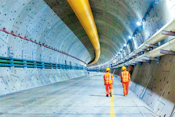 ▲2025年8月28日,京滨城际铁路天津机场2号隧道完成盾构掘进,实现顺利贯通。图为工作人员在隧道内巡检。(新华社发 王晓婧/摄)