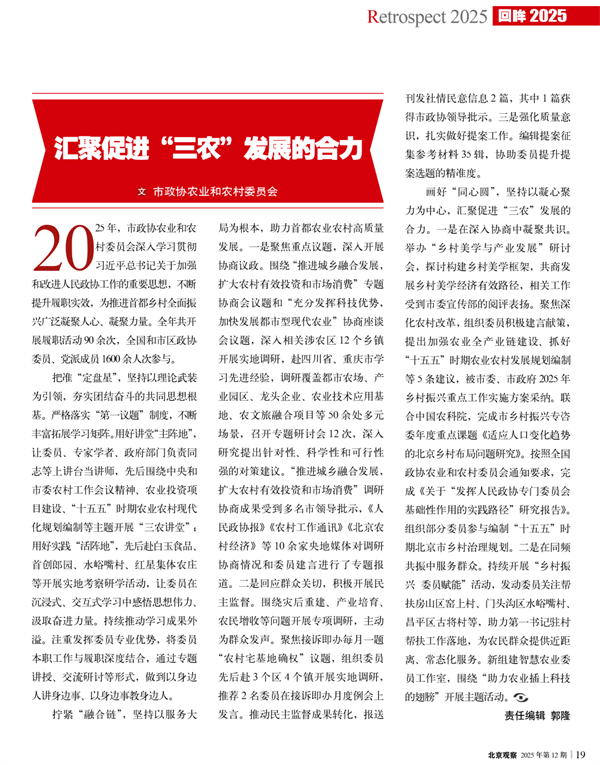 画好“同心圆”,坚持以凝心聚力为中心,汇聚促进“三农”发展的合力。一是在深入协商中凝聚共识。举办“乡村美学与产业发展”研讨会,探讨构建乡村美学框架,共商发展乡村美学经济有效路径,相关工作受到市委宣传部的阅评表扬。聚焦深化农村改革,组织委员积极建言献策,提出加强农业全产业链建设、抓好“十五五”时期农业农村发展规划编制等5条建议,被市委、市政府2025年乡村振兴重点工作实施方案采纳。联合中国农科院,完成市乡村振兴专咨委年度重点课题《适应人口变化趋势的北京乡村布局问题研究》。按照全国政协农业和农村委员会通知要求,完成《关于“发挥人民政协专门委员会基础性作用的实践路径”研究报告》。组织部分委员参与编制“十五五”时期北京市乡村治理规划。二是在同频共振中服务群众。持续开展“乡村振兴委员赋能”活动,发动委员关注帮扶房山区窑上村、门头沟区水峪嘴村、昌平区古将村等,助力第一书记驻村帮扶工作落地,为农民群众提供近距离、常态化服务。新组建智慧农业委员工作室,围绕“助力农业插上科技的翅膀”开展主题活动。(文:市政协农业和农村委员会)