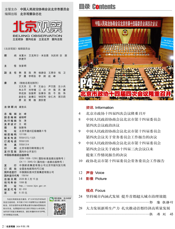 2026年是“十五五”开局之年,站在新的历史起点上,北京这座兼具千年文脉底蕴与创新活力的都市,正以首善标准擘画中国式现代化北京新篇章,在高质量发展的征程上步履铿锵。《北京观察》2026年第2期,我们聚焦北京市政协十四届四次会议核心议题,全景呈现首都在高质量发展、民生保障、文化繁荣等领域的实践探索,于协商民主的生动实践中,展现新时代首都政协的责任与担当。