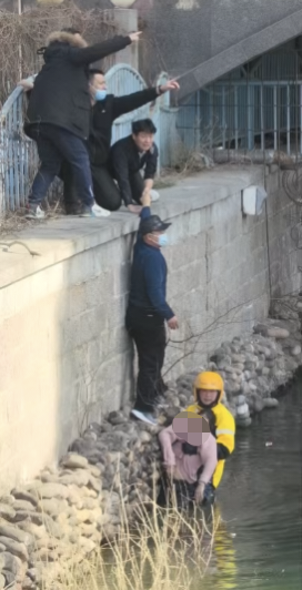 2月12日中午,积水潭桥西河边上演了一幕暖心又惊险的救人瞬间,一位女士在河水中,面朝下漂浮着,美团骑手张蒙蒙不顾个人安危,跃下两米来高的垂直河堤,跳入冰冷河水中,成功对其进行了营救。