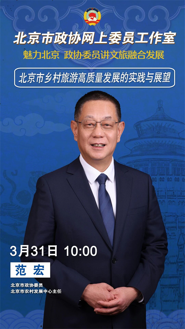 3月31日(星期二)10:00,北京市政协网上委员工作室“魅力北京 政协委员讲文旅融合发展”2026年第一讲将准时与您见面。北京市政协委员,北京市农村发展中心主任范宏以“北京市乡村旅游高质量发展实践与展望”为题开讲。