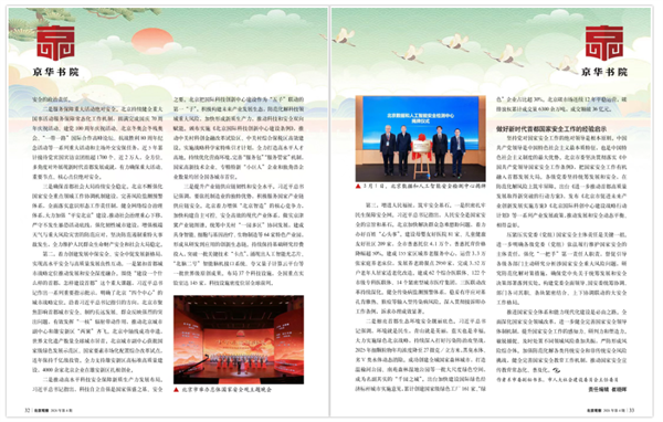 二是推动高水平科技安全保障新质生产力发展布局。习近平总书记指出,科技自立自强是国家强盛之基、安全之要。北京把国际科技创新中心建设作为“五子”联动的第一“子”,积极构建未来产业发展生态,防范化解科技领域重大风险,加快形成新质生产力,推动科技和安全双向赋能。颁布实施《北京国际科技创新中心建设条例》,推动中关村科创金融改革试验区、中关村综合保税区高效建设。实施战略科学家特殊引才计划,全力打造高水平人才高地。持续优化营商环境,完善“服务包”“服务管家”机制,国家高新技术企业、专精特新“小巨人”企业和独角兽企业数量均居全国各城市首位。