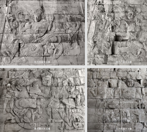 一张黑白色的图片,生动地描绘着居庸关过街塔的云台券道浮雕四大天王,他们头戴宝冠、身着铠甲、肩挎锦帛、足蹬长靴,威风凛凛。但鲜为人知的是,四大天王原本是身着世俗贵族男子服饰的形象,在佛教进入中国后才演变为身着铠甲的武将形象。