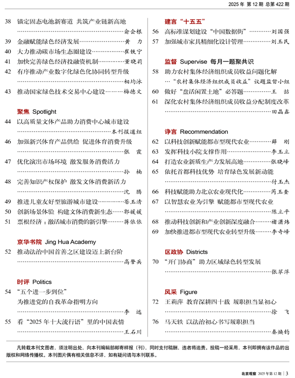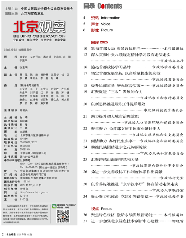 - 岁末冬深,新时代首都发展的暖意与期盼交织。2025年,是“十四五”圆满收官、“十五五” 谋篇布局的关键之年。本期《北京观察》作为年度收官刊,以“回眸2025”开篇,集中展示市政协机关各部门履职尽责的丰硕成果,从推进主题教育、擦亮学习品牌、提升提案实效,到助力首都高质量发展、超大城市治理,从助力都市型农业发展、促进民族团结、到加强制度建设、全面铺开“京华议事厅”,全景呈现政协服务新时代首都发展挺膺担当。